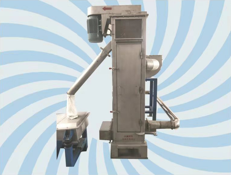 干燥機(jī)是將塑料粒子與水分離的一種設(shè)備。粒子和水進(jìn)入干燥機(jī)在離心力的作用下,粒子以高速、螺旋的形式向上輸送。在向上輸送的過(guò)程中,粒子表面水分與粒子進(jìn)行分離,干燥室上部通風(fēng)機(jī)產(chǎn)生的氣流與粒子逆向運(yùn)動(dòng),加速粒子表面水分與粒子進(jìn)一步分離,完成氣流干燥過(guò)程。潮濕空氣由通風(fēng)機(jī)經(jīng)出風(fēng)管排入大氣,分離出來(lái)的水由出水口排出,粒子得到充分干燥后經(jīng)出料斗排出。